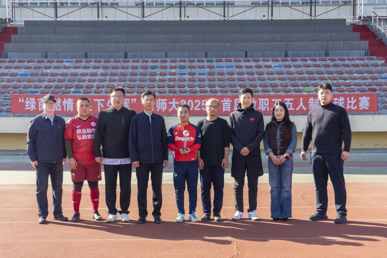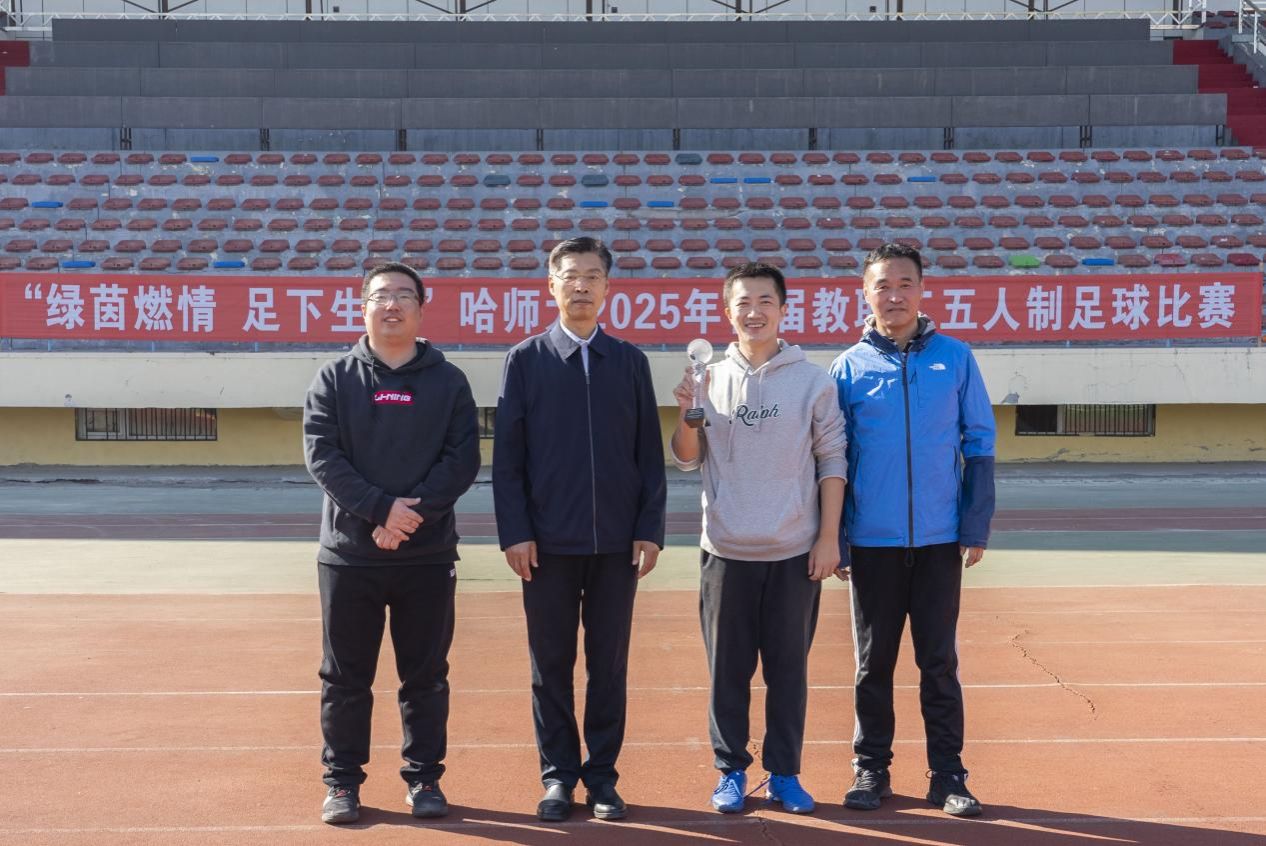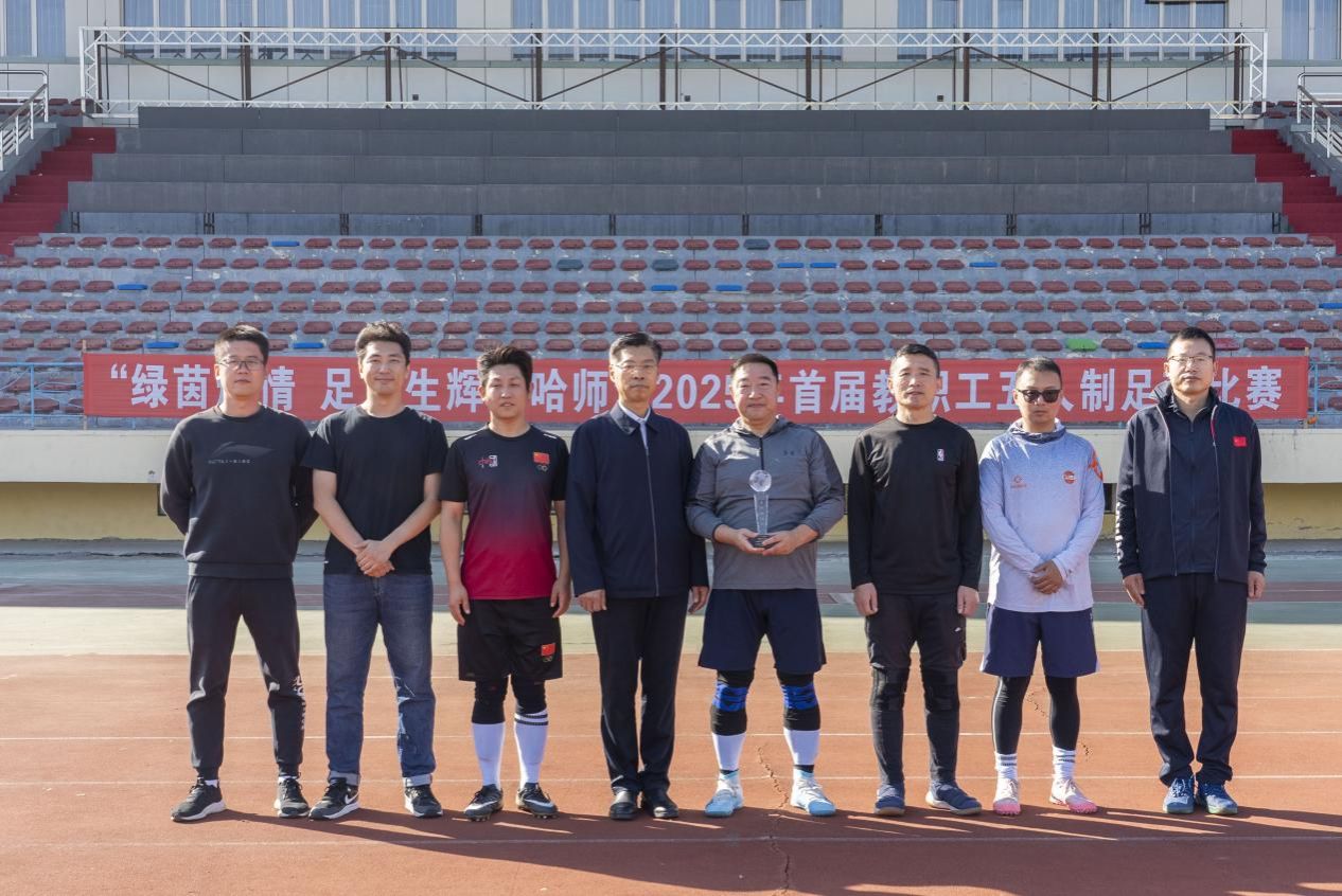 10月11日中午,历时7天激烈角逐的“绿茵燃情 足下生辉”哈尔滨师范大学2025年首届教职工五人制足球比赛在主校区体育场圆满落下帷幕。校长蒋鲲,党委常委、副校长尹剑锋,党委常委、副校长徐国峰,党委常委、副校长李岗到现场观看比赛。闭幕式由校工会副主席李立平主持。