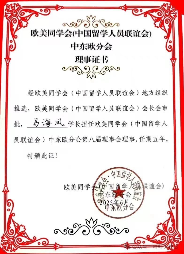 近日,经欧美同学会(中国留学人员联谊会)地方组织推荐和总会会长会议审议通过,我校数学科学学院教授、博士生导师马海凤当选为欧美同学会(中国留学人员联谊会)中东欧分会第八届理事会理事,任期五年。