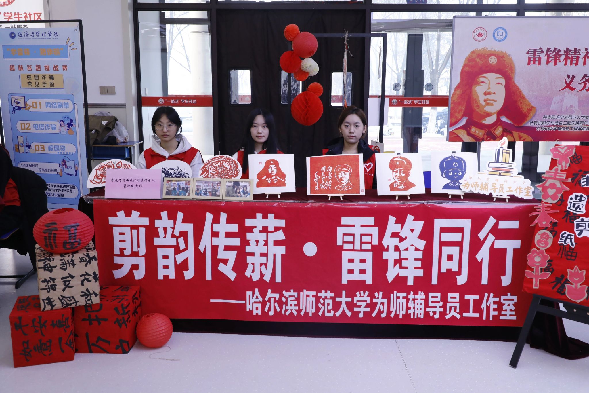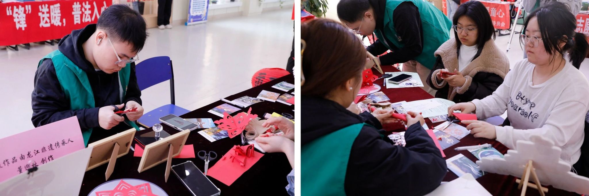 文学院“为师”辅导员工作室携手龙江非遗传承人董迎秋,以非遗剪纸为载体,传承雷锋精神。现场展出特色剪纸作品,开设公益剪纸体验,引导同学们在动手创作中感悟奉献、友爱品质。以指尖技艺传递温暖,用非遗文化弘扬雷锋精神,让青春与志愿同行。