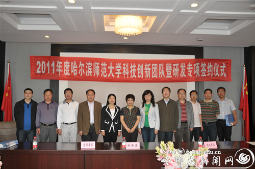 签约仪式上励强华宣布了2011年入选哈尔滨师范大学科技创新团队、研发专项的项目名单。臧淑英代表学校与相关人员签约。