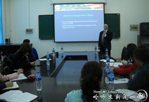 (新闻网记者林欣/撰文 林欣/摄影)3月15日下午,西语学院在外语楼527室举办了最新英语教学法学术论坛。美国驻北京领事馆英语教学办公室主任 Damon Anderson教授、黑龙江外事办副主席等人应邀出席,学院部分教师及研究生参与了此次论坛。