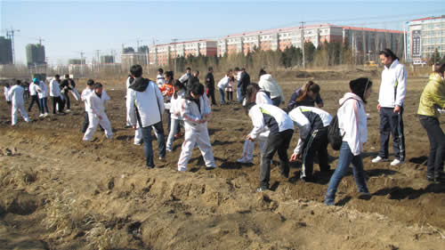 播种之前,指导教师认真讲解了播种的注意事项,并亲自示范了播种方法,使同学们在了解播种方法的同时也认识到此次播种实践活动的重要性。在试验田里,同学们按照老师的指导认真地做每一个步骤,动作虽不熟练,但同学们积极认真的态度、渴求知识的精神得到了老师的赞许。此次实践活动共播种17个试验区,近十个春小麦品种。