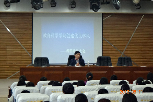 5月11日下午,教育科学学院“创建优良学风”系列活动之考研动员大会在梦溪宾馆二楼会议室举行。教育科学学院院长、博士生导师温恒福教授针对学院09级全体学生做了一场关于考研、就业的专题报告会。秉承着“敦品励学、弘毅致远”的校训,温恒福从升学、就业以及个人成长三个层次强调学生学习的重要性,深刻而细致地为同学们分析当前的就业形势和考研的重要性,鼓舞广大三年级学生要保持坚持不懈的学习精神,并针对同学们提出的疑虑和困难,一一给予了细致解答。