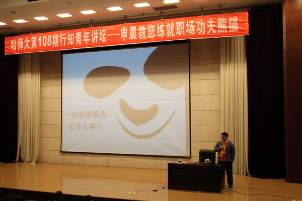 讲座开始,申晨以他幽默风趣的语言描述了哈尔滨的大雪天气给刚下飞机的自己带来的不适应感觉,瞬间拉近了与同学们的距离。随后,他讲述了同学们应该如何写简历、面试中面试官看重求职者的哪些方面、求职者面试前应准备些什么、面试中需要注意哪些问题以及面试后应该做哪些事等等一系列问题。整个讲述具体、详细、清晰、流畅,同学们大受启发。申晨与大家分享了自己的大学生活,并告诫大家:最后的大学时光别留下遗憾,临近毕业哪些事值得去做。最后,现场互动环节将整场讲座推向高潮,大家争先恐后,纷纷提出所关心的问题,申晨以其幽默风趣的语言赢得了在场同学的阵阵掌声。
