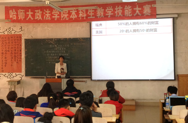 10月9日,政法学院第二届本科生教学技能大赛在社科楼501举行。本次比赛特邀哈三中和师大附中的政治骨干教师担任评委。本次比赛共有28名学生报名参赛,经过初选,有12名选手进入比赛。