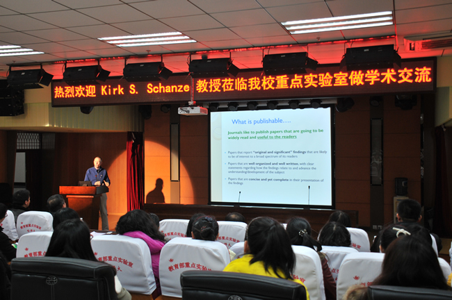 (张强/文) 3月4日上午,应光电带隙材料省部共建教育部重点实验室邀请,美国化学学会主办的著名杂志ACS Applied Materials & Interfaces主编Kirk S. Schanze教授在科学会堂重点实验室报告厅为我校师生作了题为“How to Write an Effective Research Paper”的报告。物理与电子工程学院院长张喜田教授、重点实验室部分教师和研究生参加了报告会。