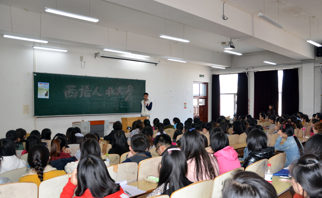 (仲微微/文)为进一步提高学院学生的考研热情,明确考研目标,掌握相关考研技巧,了解更多考研信息。4月9日,西语学院举办了主题为“西语人 北大梦”的考研经验交流会,由学院2009级应用英语系翻译专业学生高金华介绍其考研经验。高金华同学于2014年考取了北京大学外国语学院MTI笔译专业硕士研究生。本次经验交流会吸引了各专业正在备考研的学生前来聆听,现场座无虚席。