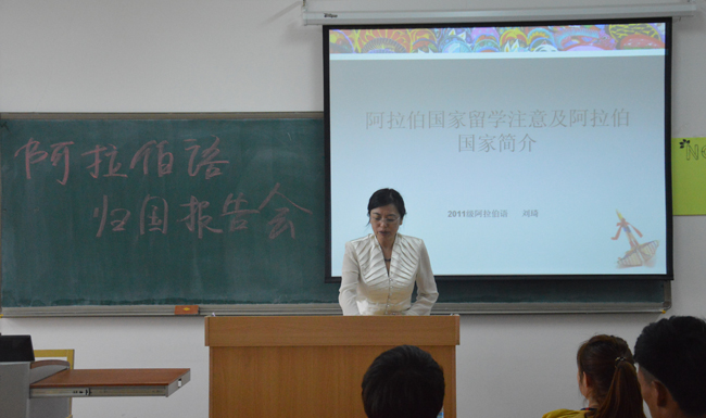 王琪从阿拉伯语专业建设、人才培养、质量提升、就业角度对即将参与留学项目的同学做了动员,并介绍了我校与埃及坦塔大学的合作项目,对学成归来的学生表示欢迎,鼓励2012级全体学生无论是在国内还是出国留学都要认真学习语言及跨文化交流的相关知识,祝愿即将留学的学生取得丰硕成果。随后从埃及坦塔大学留学归来的七名学生分别从留学准备、注意事项、学习经验、留学生活、埃及游学等注意事项进行了详细、全面的介绍。