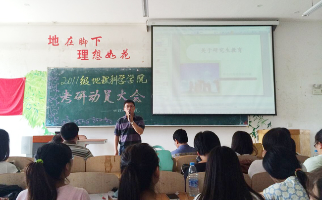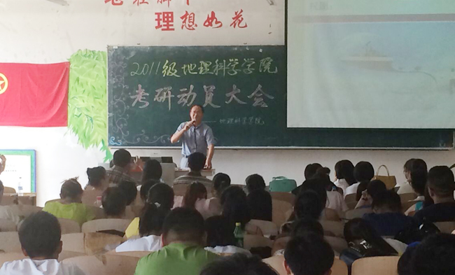 (张立辉/文)7月7日下午,地理科学学院在理工三号楼220教室召开考研动员大会。学院党委书记蒙国军、院长万鲁河等领导和老师以及2011级全体学生参加了动员会.会议由蒙国军主持。、