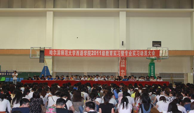 (仲微微/文)为动员教育即将奔赴教育实习和专业实习单位的2011级全体学生统一思想,提高认识,明确任务,深入扎实地开展实习工作,有效提升实际工作能力,为今后更好地服务社会奠定坚实基础,7月11日,西语学院召开了2011级全体学生教育实习和专业实习动员大会。学院党政领导,英语教育系教法教研室与应用英语系实践教研室的全体教师,60余位实习指导教师以及2011级英语教育和应用英语专业学生1100余人参加了本次动员大会。