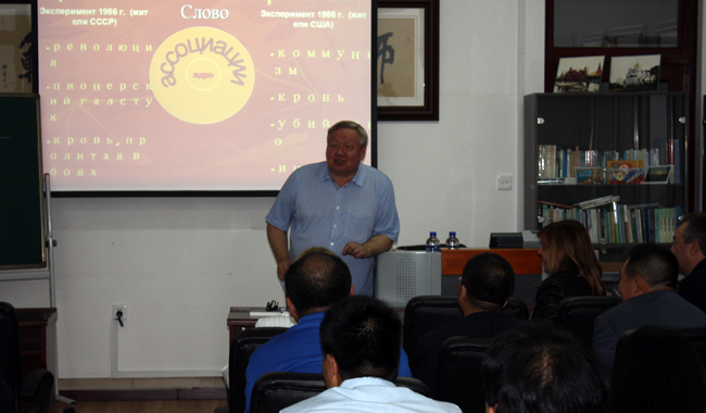 讲座人为语言学博士、俄罗斯人民友谊大学人文与社会科学系俄语及跨文化交际教研室主任В.П.西尼亚奇金教授,主题为基于语言民族性的对外俄语教学新方法。西尼亚奇金教授为俄罗斯著名的心理语言学专家,他结合俄语特点,依据心理语言学、语言文化学等理论,深入浅出、生动形象地为师生们讲解了俄语的发音特点、常用词的词源、其独创的俄语语法学习和教学方法以及俄语构词中体现出的语言民族性。讲座引起在场师生的强烈共鸣。