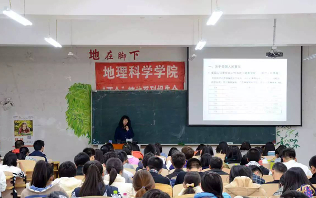 (张立辉/文)为了进一步提升学院学生的学术水平,提高对国际前沿的地理学体系的认识,10月27日,地理科学学院邀请了从美国学习归来的张丽娟教授在理工三号楼220教室为学院师生做了题为“你所不知道的美国”专题报告。学院相关领导、辅导员及2015级学生参加了此次专题报告会。