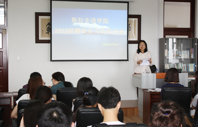 (黄杨春/文)2016年9月份,斯拉夫语学院2015级翻译硕士研究生将奔赴实习点进行为期4个多月的专业实习。为积极推进这项工作全面展开,6月22日下午,斯拉夫语学院在社科楼903学科中心召开2015级翻译硕士实习动员大会。大会由学院翻译硕士硕士点负责人李俊玉主持。斯拉夫语学院副院长赵晓彬、2015级全体翻译硕士指导教师以及15级全体翻译硕士研究生参加此次会议。