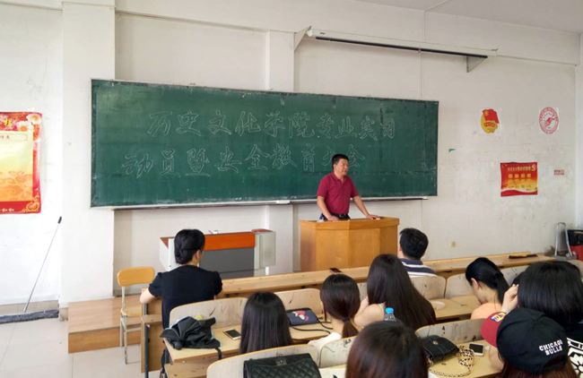 (方智/文)6月22日下午,历史文化学院在人文楼520教室召开了2013级旅游管理和文物保护技术专业实习动员暨安全教育大会。学院院长王军、党委副书记李斌、副院长杨超及旅游管理专业、文物保护技术专业的教师、全体同学参加了大会。