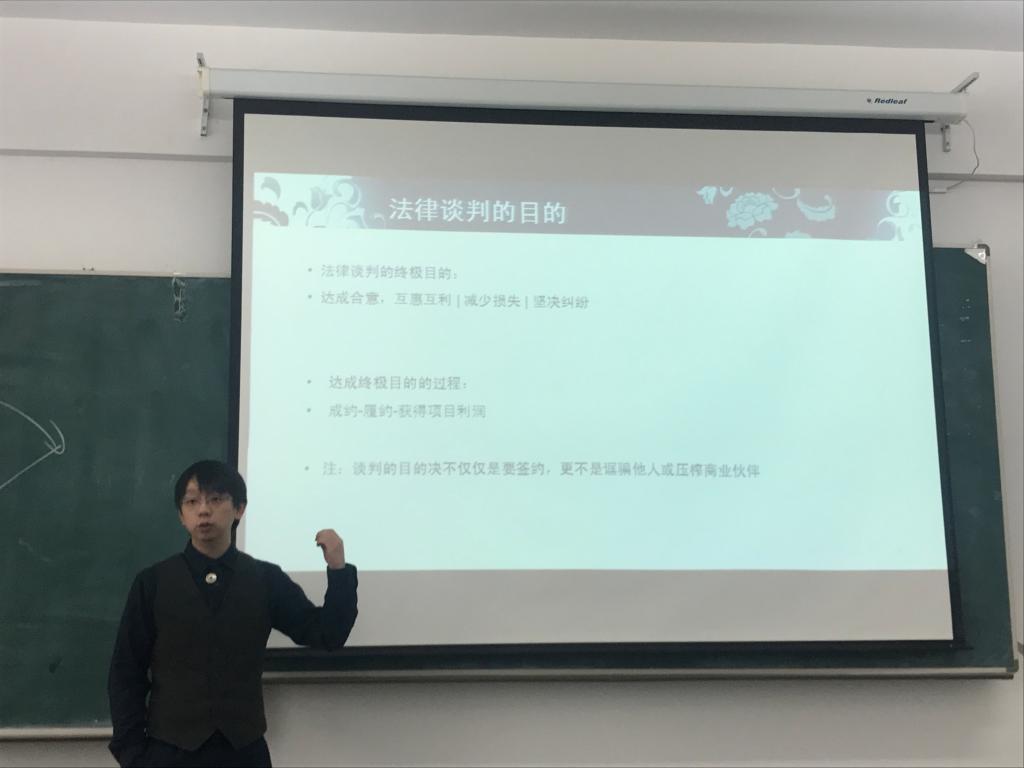 (白云/文)为拓宽学生视野,使法学理论与法律实践充分融合,提高学生的实践能力,法学院邀请黑龙江滨利律师事务所主任王秋实律师为法律硕士研究生讲授法律谈判的知识与技能。