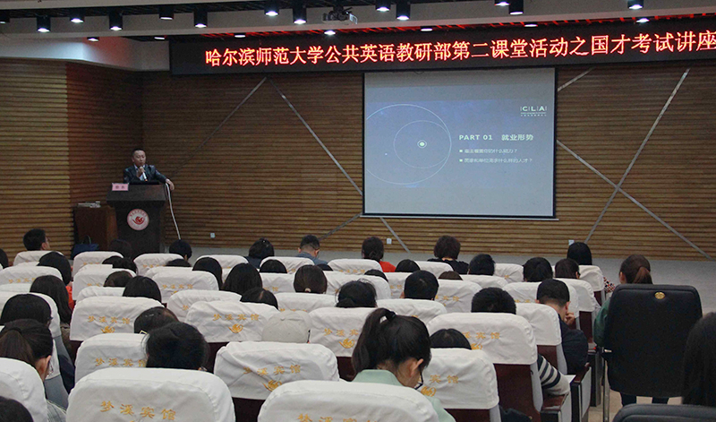 (刘艾盈/文)职通精彩未来,智通美好人生。为培养学生核心素养和英语沟通能力,提高就业核心竞争力,开拓师生的国际视野,9月26日下午,公共英语教研部特邀国才高级、高端、高翻(笔译)、高翻(交传)证书持有者徐东老师做讲座,讲座由陈杰老师主持,公共英语教研部主任顾世民教授、党委书记王淑杰教授、全体教师及来自各兄弟院校的老师和对国才考试感兴趣的学生聆听了讲座。