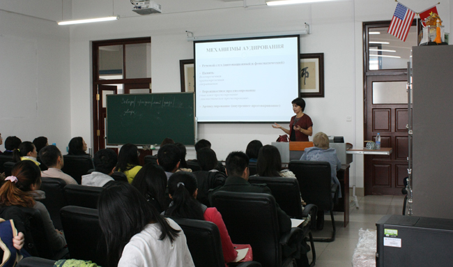 (吴哲/文) 10月8日至10日, 在俄罗斯教育部、国立普希金俄语学院“对外俄语教学新方法和手段”俄语教师进修项目框架下,黑龙江省人文社科重点研究基地“哈尔滨师范大学俄语教育研究中心”与斯拉夫语学院共同邀请来自俄罗斯南乌拉尔国立大学国际教育学院的语文学博士、对外俄语教研室主任叶琳娜·瓦吉莫夫娜·拉得琴卡教授及来自该教研室的语文学副博士尤利娅·维克多罗夫娜·卡扎科娃副教授举办了为期3天的对外俄语教学新方法和手段培训班。斯拉夫语学院的教师、研究生以及来自黑龙江外国语学院、哈尔滨华德学院、哈尔滨嵩山中学等院校的中外教师共100余人参加了此次培训。