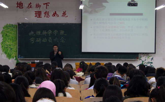 (易红/文)为了帮助同学们确立学业目标,提高同学们的学习积极性与考研热情,建立良好的学习氛围,10月23日晚,地理科学学院在理工三号楼220室面向2013级全体同学召开了考研动员大会,本次大会由学院副院长吴相利主讲。