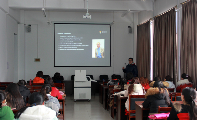 姜峰博士,国际著名应用语言学家Ken Hyland教授,是«英语沙龙»英语教育专栏特邀作者,于2013年在英国剑桥大学研修,曾在Discourse Studies, Journal of English for Academic Purposes 和English for Specific Purposes等国际SSCI核心期刊发表多篇学术文章。报告会上,姜峰以学术写作为视角,梳理了学术写作研究的发展脉络,分析了元化语篇、模糊语、立场名词等基本概念,并以本人的最新研究成果为案例,详尽展示了其研究过程和研究方法,同时介绍了学术写作中的一些热点研究问题。使同学们开拓了科研视野,丰富了研究思路,受益匪浅。