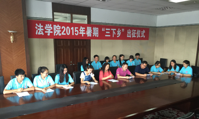 (张皓/文)为深入学习宣传贯彻党的十八大和十八届三中、四中全会以及习近平总书记系列重要讲话精神,引领广大青年学生按照习总书记 “八字真经”要求,树立和践行社会主义核心价值观。法学院于7月17日10:00在社科楼举办了2015年暑期“三下乡”出征仪式。学院党委副书记姜秀华,全体辅导员以及本次服务队成员参加出征式。