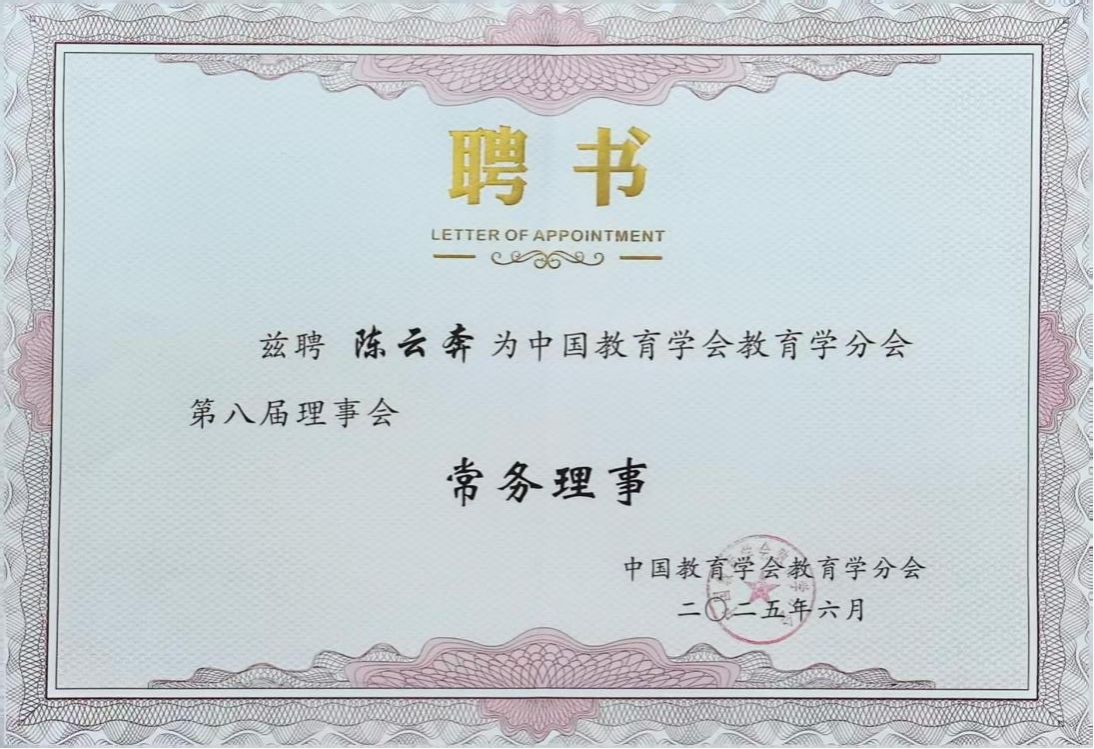 此次会议以服务国家教育强国战略为核心,聚焦教育学理论创新与实践探索。陈云奔教授的当选,既是对其个人学术贡献的充分肯定,也体现了我校在教育学研究领域的影响力。