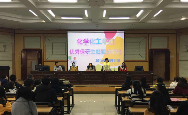 (刘国权/文)为向学生全方位、多角度解读我校研究生推免政策,帮助学生及时准确地了解研究生考试相关信息,进一步思考、规划学业生涯和职业生涯,10月11日,化学化工学院在图书馆三楼报告厅举办了优秀保研生经验分享会。学院2015级全体学生参加会议。