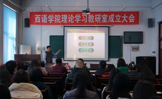 会上,院长程爽宣读了“西语学院党员‘课程化’理论学习教研室”讲师团成员名单。学院领导班子为第一届受聘为 “党员‘课程化’理论学习教研室”讲师的教师党员、学生党员颁发聘书。受聘讲师中教师代表杜娟、学生代表周仪分别在各自的发言中表示,在尽职尽责完成好党课授课任务的同时注重加强自身理论修养,以教予人,以学修己,教学相长。学院党委书记李贵彬首先介绍了关于成立理论学习教研室的思考和定位:“理论学习教研室是学院理论学习的教学师资和学习交流平台,人员由学院领导班子、党支部书记及优秀的党员组成,负责学院党团组织及党员、团员学习活动的教学、实践及活动指导工作,为理论学习提供师资和课程资源保障。”结合党团学习特点将教研室教师分为理论教学、实践指导和活动辅导三类。随后,他通过PPT重点解读了《西语学院党委党员“课程化”理论学习培养实施方案》,方案由“一个建设目标”、“两条工作主线”、“三项工作重点”、“四项管理制度”、“五个学习平台”和“六种工作机制”构成的党员理论学习培养模式。他强调学院党委把加强党员教育和促进党员成才作为中心,以建设学习型、服务型、创新型基层党组织为目标,以“课程化”理论学习模式为依托,以理论学习教研室为师资保障,在党员中开展选课制和学分制推动学习,搭建学习平台,明确工作机制,在全院教职工党员及学生党员、入党积极分子、共青团员中开展理论学习和实践活动,协同学院部门及人员,形成合力育人格局,通过党员理论学习的常态化带动团员思想理论学习的开展,实现党团理论学习和教育的常态化与长效化。最后,他以提高认识、意义重大;整合力量,统筹推进;注重落实,贵在长效为要求对实施《西语学院党委党员“课程化”理论学习培养实施方案》做了布置动员。