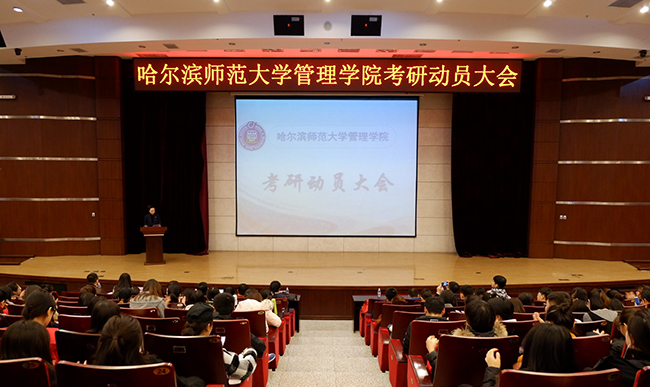 (陈凤/文)为深入贯彻落实《哈尔滨师范大学大学生思想政治教育“112349”工作模式实施方案》文件精神,增进同学们对考研的了解,帮助同学们树立考研目标,为准备考研的同学指明方向,管理学院于3月22日下午在科学会堂举办了考研动员大会,管理学院院长、硕士生导师赵辰光教授,党委副书记刘宗波,副院长、硕士生导师徐光教授,学院硕士生导师王淑娟副教授和李宝虹副教授,各年级辅导员出席了本次动员会。学院2014级、2015级学生参加了本次动员会。