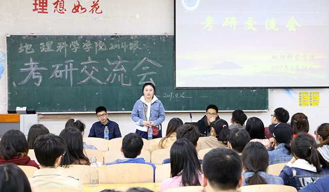 (陈莹莹/文)为深入贯彻我校"112349"思想教育工作模式实施方案文件精神,提升学生专业情志教育内涵,注重实效、抓住关键点,分层次、分年级做好学生日常学业与职业生涯规划。同时,遵循和尊重学生学习、成长需要,及时、有针对性地解决学生实际问题,积极鼓励广大同学通过考研继续进行学历提升和专业素养提高,以考研促进日常学风建设,促进就业质量提高,地理科学学院于4月26日在理工三号楼和崇师楼分专业召开了地理科学学院召开考研交流分享会暨专业情志教育之考研一帮一互助社区启动仪式。学院2014级全体同学参加分享会,学院2013级来自地理科学等五个专业的12名成功考取研究生的优秀学生代表作为分享会的嘉宾和互助典型参加了本次会议。