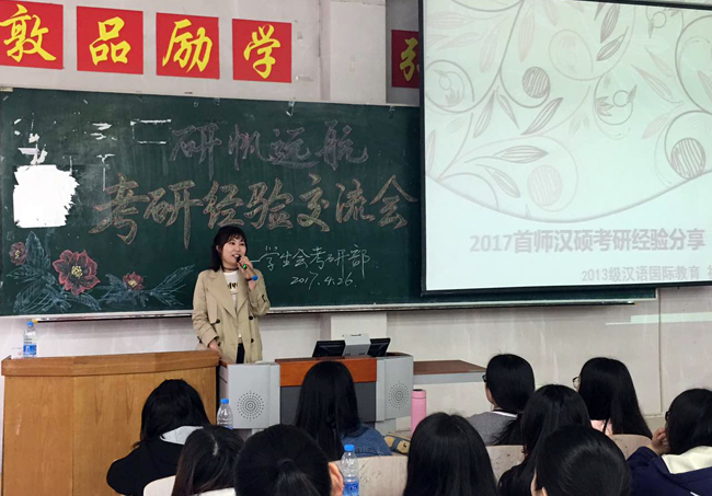 此次经验交流会邀请了学院2013级的8名优秀考研生,他们是“复试逆袭”考取北京语言大学的朱莉凡,保送首都师范大学的何阿敏,唯一农村教育硕士孙艳娇,考取吉林大学的朱文琦,总分419的郝晓慧,英语80分考取陕西师范大学的赵欣悦,跨省跨专业考取东北师范大学的唐阔,全能型考研战将祖成瑶。他们专业知识过硬、特色鲜明、思路清晰,为同学们带来了一场全面的视听盛宴。活动过程中,同学们认真倾听,积极提出问题,主讲人也对同学们考研过程中可能遇到的问题作出了解答。