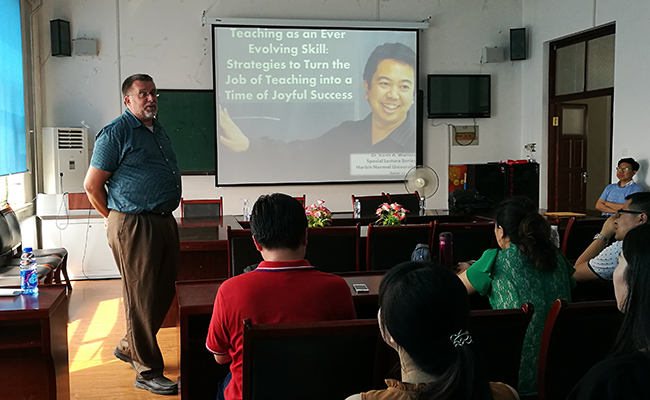 (徐伟伟/文)6月28日在西语学院在527会议室举办了“扩大课堂教师成长方案”主题讲座。本次讲座由西语学院王莉娅教授主持,美国Keith A.Walters教授主讲,学院青年教师、研究生以及本科生参加此次讲座。