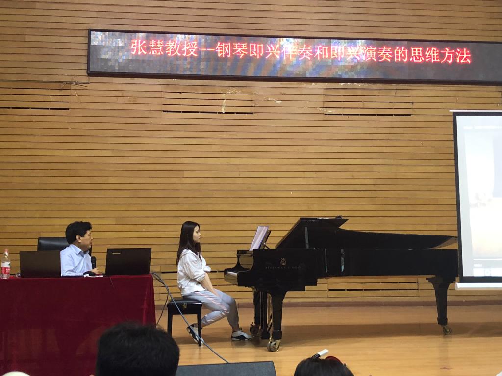 张慧教授通过实例对比和示范演奏对钢琴即兴伴奏和演奏的思维方式进行了深入浅出的讲解,并对音乐教育系的学生做了现场指导,使在场的师生受益匪浅。最后的现场互动环节场面热烈,同学们纷纷举手提问,张慧教授对学生们提出的问题一一进行解答,得到在场师生的热烈欢迎和一致好评。