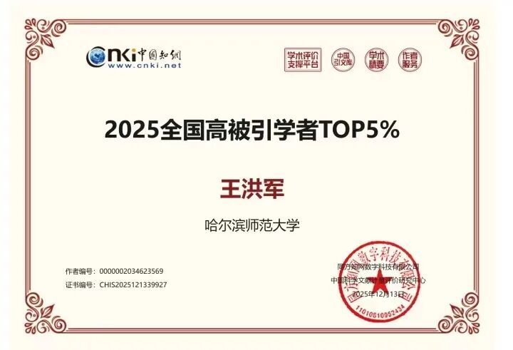 此次我校文学院王洪军教授同样入选“中国知网高被引学者”TOP5%名单,充分彰显了文学院整体的学术实力与学科建设成效。多年来,我校文学院长期致力于打造高水平学术团队,不断拓展研究领域,并通过加强师资队伍建设、推动国内外学术交流,有效提升了教师的学术视野与影响力。