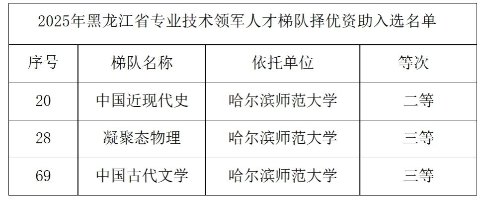 近日,黑龙江省人力资源和社会保障厅公布的《2025年黑龙江省专业技术领军人才梯队择优资助入选名单》中,我校有3支梯队获批黑龙江省专业技术领军人才梯队择优资助梯队,全省共74支梯队获批。其中,中国近现代史梯队获二等资助、凝聚态物理梯队和中国古代文学梯队获三等资助。