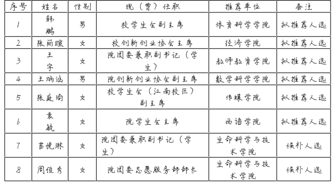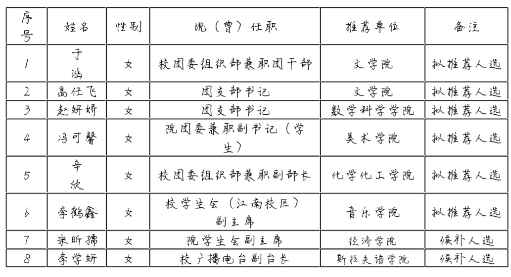 拟推荐6名同学为黑龙江省青年志愿者助力兴边富民计划大学生支教团成员人选,2名同学为黑龙江省青年志愿者助力兴边富民计划大学生支教团成员候补人选。公示名单如下: