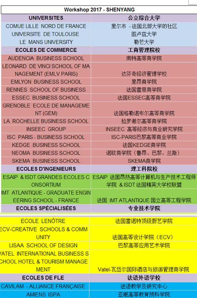 法国驻沈阳总领馆为促进中法两国校际合作和推广法国高等教育,给我校提供与法国23所知名高校的招生负责人进行一对一面谈的机会,此次活动是东北地区有史以来规模最大的官方公益性中法教育交流活动,信息如下: