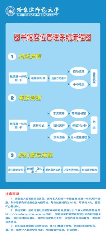 图书馆工作人员将为本系统提供支持保障,竭诚为全校师生提供优质服务。(附:《图书馆座位管理系统流程图》、《图书馆自习区座位管理规则》)