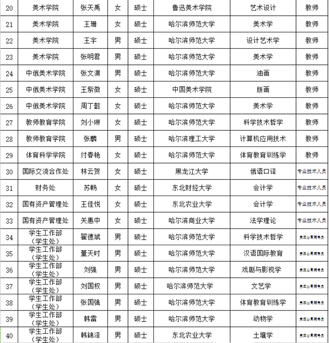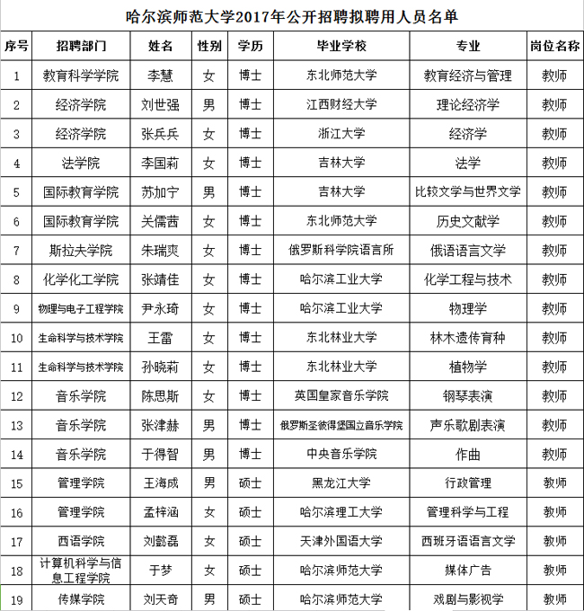 按照《黑龙江省事业单位公开招聘工作人员实施细则》的规定,根据《哈尔滨师范大学2017年公开招聘人员公告》招聘的原则、程序和方法,经哈尔滨师范大学校长办公会审定,现将拟聘用人员予以公示,公示期为7个工作日。如对拟聘用人员有异议,可在公示期内反映,反映情况和问题必须实事求是,应签署或告知真实姓名、工作单位和联系方式;对线索不清的匿名信和匿名电话,公示期间不予受理。