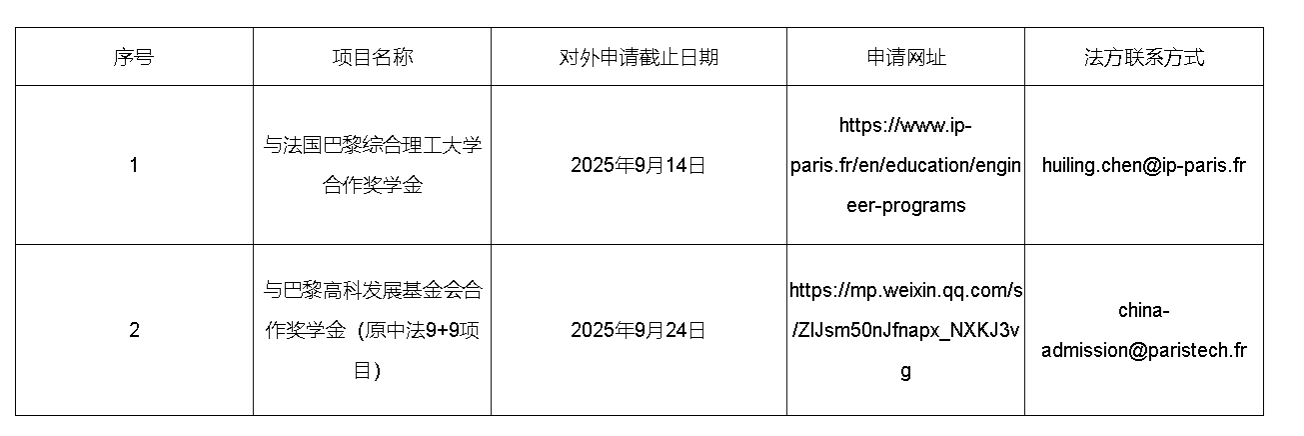 根据国家留学基金管理委员会(以下简称国家留基委)与法国巴黎综合理工大学、巴黎高科发展基金会分别签署的合作协议,中法双方每年将选派优秀人员赴法开展工程师教育。2026年上述合作奖学金的法方申报工作即将启动,现将我校有关工作安排通知如下。