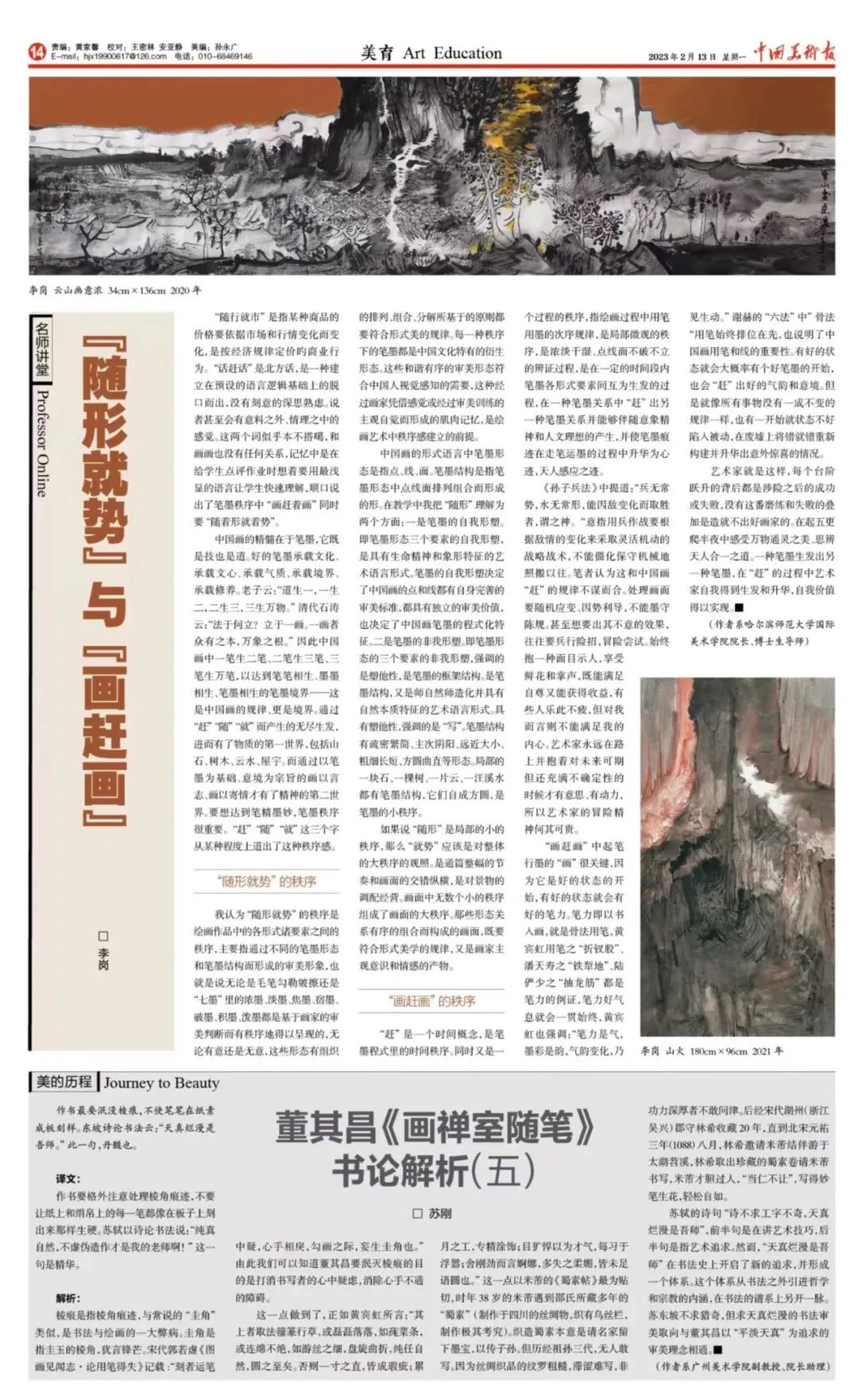 李岗在文章中深刻阐述了中国画绘画中“随形就势”和“画赶画”的秩序,总结了中国画形式语言中笔墨形态以及形式美学的规律,强调艺术家要感受万物通灵之美、思辨天人合一之道,在创作中得到生发和升华,实现艺术家的自我价值,为繁荣社会主义艺术事业作出积极贡献。与文章同时刊发的还有李岗的两幅中国画作品:《云山画意浓》和《山火》,无论是毛笔勾勒皴擦还是“七墨”里的浓墨、淡墨、焦墨、宿墨、破墨、积墨、泼墨都是基于画家的审美判断而有秩序地得以呈现,每一种秩序下的笔墨都是中国文化特有的衍生形态,体现了画者超高的艺术造诣,对于弘扬中国美术精神、彰显中国美术气派具有里程碑式的意义。