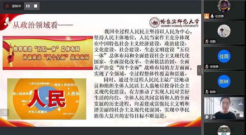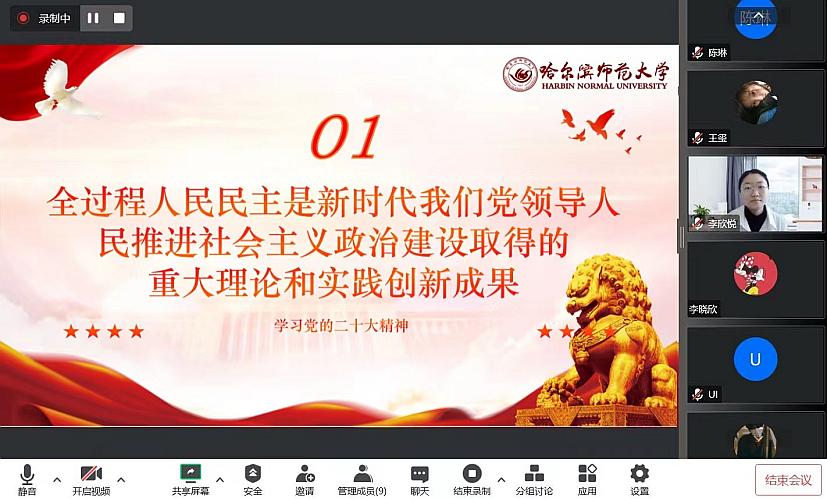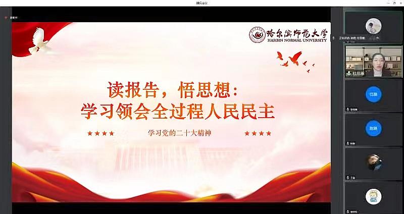 1月6日,宣讲团成员刘橦向黑龙江省齐齐哈尔市龙沙小学的学生家长作题为《办好人民满意的教育》的宣讲;1月9日,宣讲团成员徐燃向大庆市林甸县花园镇光明村村民作题为《党的二十大报告内容解读》的宣讲;1月10日,宣讲团成员杜思蕙、李佳薇、李欣悦、王玺分别向辽宁省葫芦岛市五里河社区居民、黑龙江省虎林市铁南社区居民、呼伦贝尔市莫力达瓦达斡尔族自治旗腾克镇西也必奇村村民、黑龙江省伊春市乌翠区乌马河街道居民作题为《读报告,悟思想:学习领会全过程人民民主》的宣讲;1月11日,宣讲团成员王心宇向黑龙江省齐齐哈尔市建华区黎明村村民作题为《全面推进乡村振兴》的宣讲。