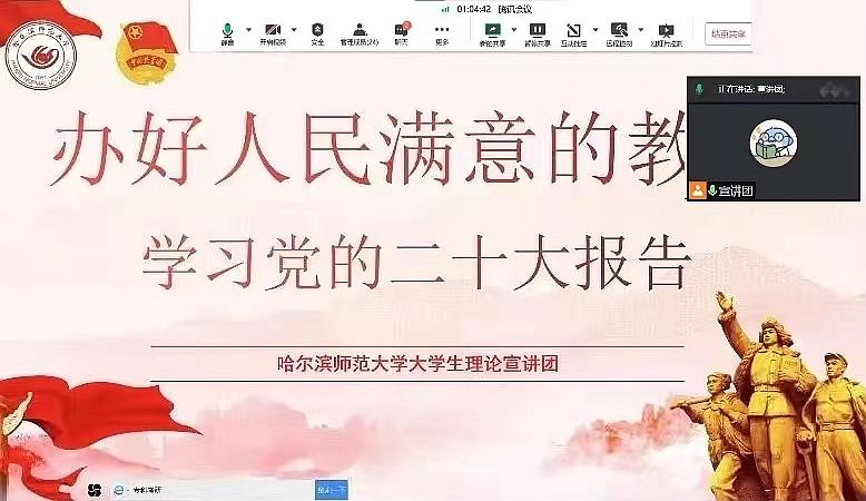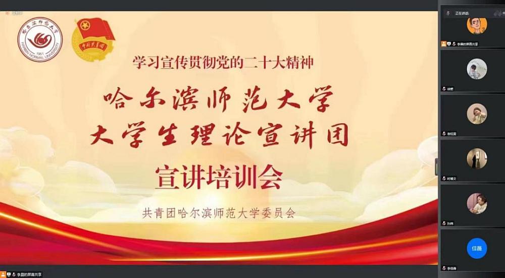 为深入学习宣传贯彻党的二十大精神,全面贯彻习近平新时代中国特色社会主义思想,不断精准学校共青团服务地方发展的切入点,让青年理论宣讲惠及不同群体、渗透不同领域,哈尔滨师范大学大学生理论宣讲团全体成员自返乡后走进基层开展理论宣讲活动,截至12日,宣讲团成员分别向大庆、齐齐哈尔、葫芦岛、呼伦贝尔等市(县、区)的基层党员干部和群众、中小学师生开展宣讲活动,累计开展宣讲7场,用“青言青语”“乡言乡语”将党的二十大精神传递至家乡母校、乡村社区。