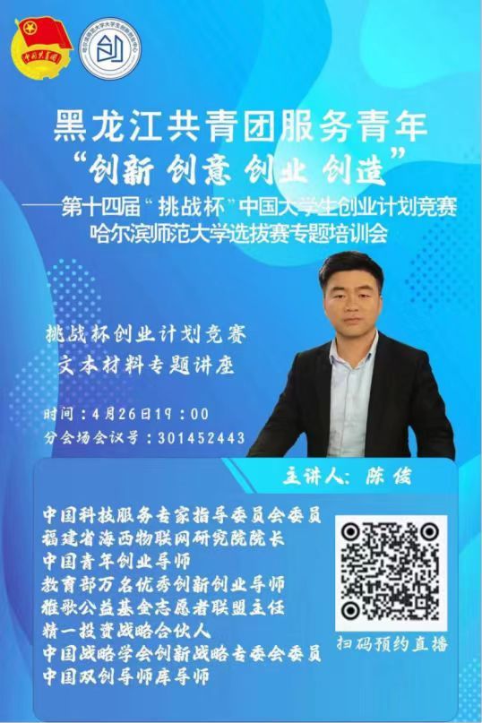 为深入学习贯彻习近平新时代中国特色社会主义思想,落实黑龙江共青团服务青年“创新 创意 创业 创造”工作要求,不断激发我校青年学子投身“四创”热情,营造“敢于创新、富于创意、勇于创业、乐于创造”的浓厚氛围,推进第十四届“挑战杯”中国大学生创业计划竞赛备赛工作,4月26日晚,学校团委举办黑龙江共青团服务青年“创新 创意 创业 创造”——第十四届“挑战杯”中国大学生创业计划竞赛文本材料专题讲座,讲座邀请中国科技服务专家指导委员会委员、中国战略学会创新战略专委会委员、中国双创导师库导师陈俊为参赛师生针对大赛文本材料书写作专题辅导。