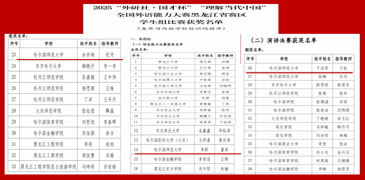 近日,由中共黑龙江省委宣传部、黑龙江省教育厅、外研社共同主办的“外研社•国才杯”“理解当代中国”全国外语能力大赛黑龙江省决赛圆满落幕。我校学生凭借扎实的语言功底、出色的综合素养与深厚的家国情怀,勇夺省赛综合能力组金奖、银奖、演讲组铜奖各一项。我校教育科学学院学生李跃在本次比赛中荣获综合能力组金奖,并与其他16名省内高校优秀学子共同晋级国赛。